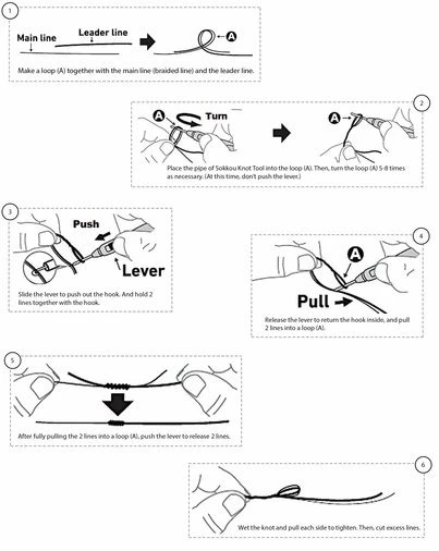 Simple but brilliant, the Sokkou Knot Tool is designed to make knotting a mono leader to braid easier and perfect every time! With the lines in parallel all it takes is a couple twists around the barrel, a pick up with the retractable hook and pull through… done!