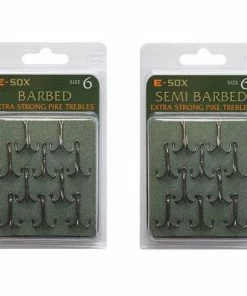 - E-Sox Snap Tackle wire traces are ideal for all live and deadbait presentations. They incorporate strong treble hooks in sizes 6, 8 and 10 and in a choice of Barbed or Semi Barbed varieties. Each E-Sox Snap Tackle trace is 40cm long and made from reliable 24lb stainless steel 7 Strand wire with slim crimps securely attaching the treble hooks. The size 10 trebles are ideal for small prey fish between 9cm and 11cm. The size 8s are best suited to medium-sized baits from 11cm to 13cm. The largest size 6 trebles are best matched to larger fish of 13cm to 15cm.